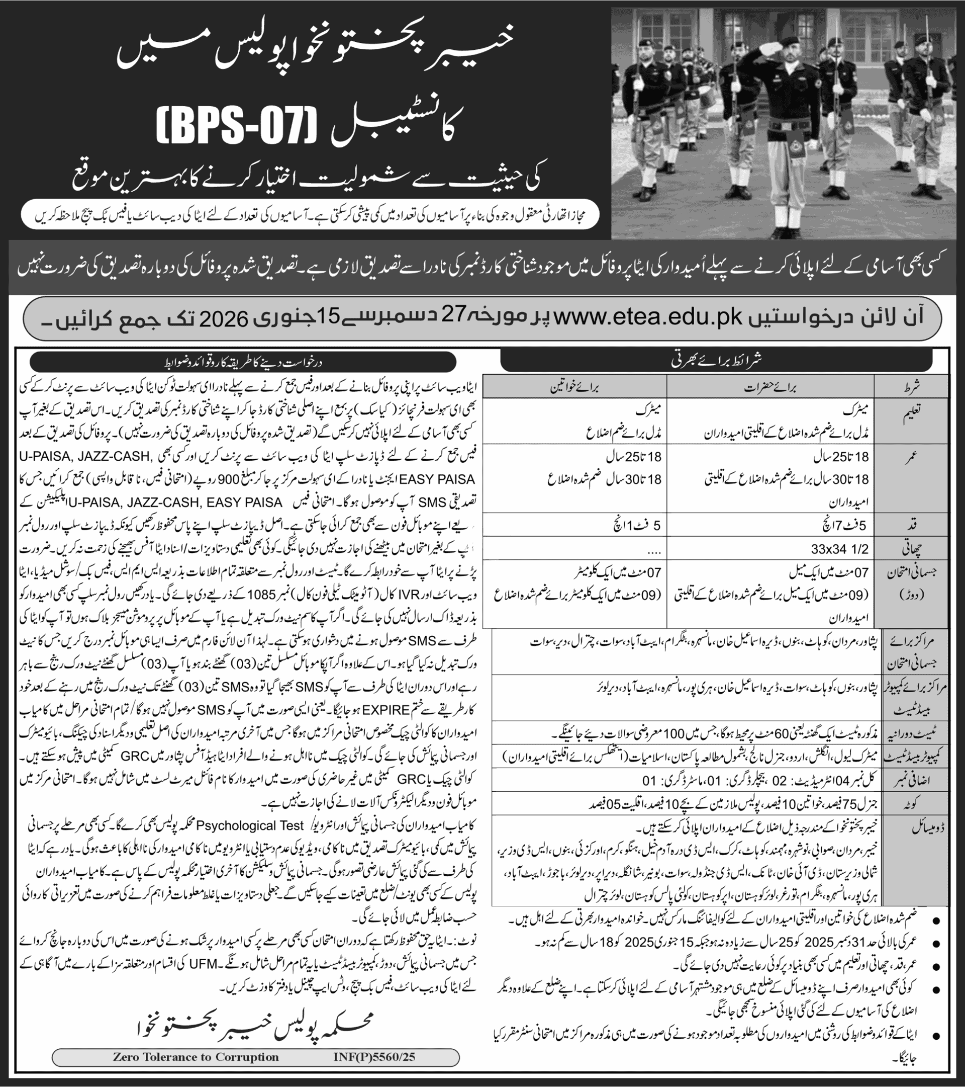 Khyber Pakhtunkhwa Police (KPK) has announced Constable vacancies across multiple districts including Peshawar, Upper Dir, Lower Dir, Battagram, Kohat, Mansehra, Haripur, Chitral, Bannu, Mardan, Abbottabad, Swat, and Dera Ismail Khan. The advertisement was published in the Daily Aaj Newspaper on December 27, 2025. Candidates with a Matric qualification will be preferred. These are government security positions, and eligible applicants can apply online through ETEA. The last date to submit applications is January 15, 2026, or as mentioned in the official advertisement.